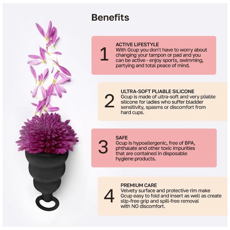 The main advantage and innovation of the Gcup is its internal structure. Inside the container there is a check valve that prevents the liquid from escaping. The Gcup menstrual cup is shaped like a bell, which makes it easy to use.