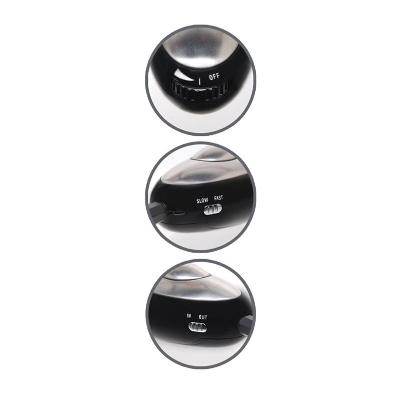 The Luv Touch compact control unit sends electrical impulses to the clamps and can be used alone as a hand massager or together with the clamps. To use the control as a hand massager, switch to “IN” mode. The oval center piece delivers the shock once your palm touches any other part of the metal. To use the power unit with the clamps, switch it to “OUT” mode and connect the clamps plug-in jack.